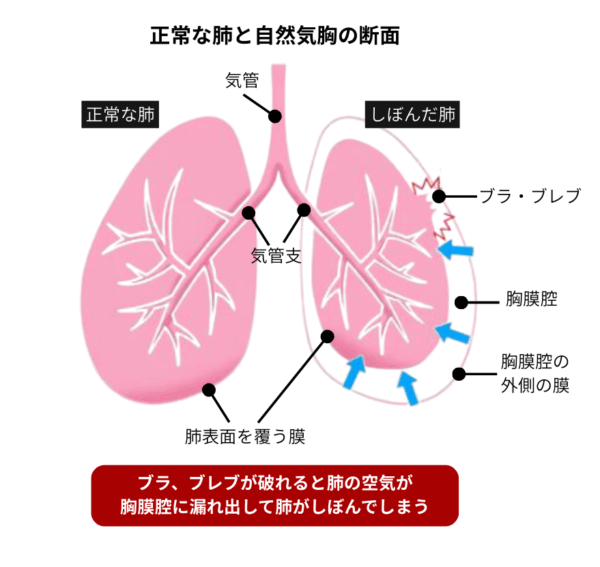 気胸とは、肺に小さな穴があき、そこから空気が漏れて肺がしぼんでしまう状態です。