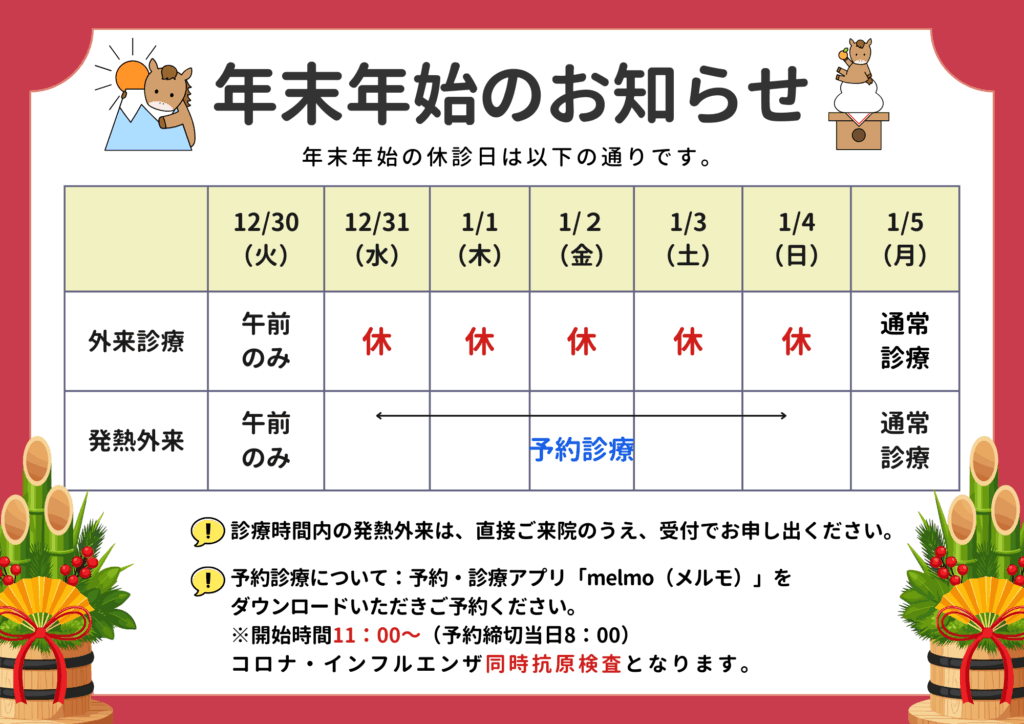 12/31(水)~1/4(日)の期間、臨時で発熱外来を実施いたします。(完全予約制)