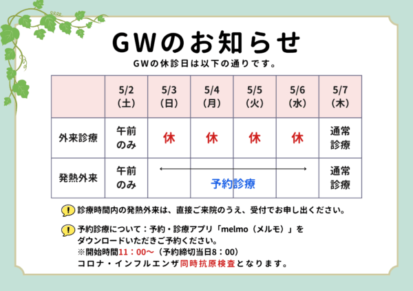 ゴールデンウィークの休診日のお知らせです。